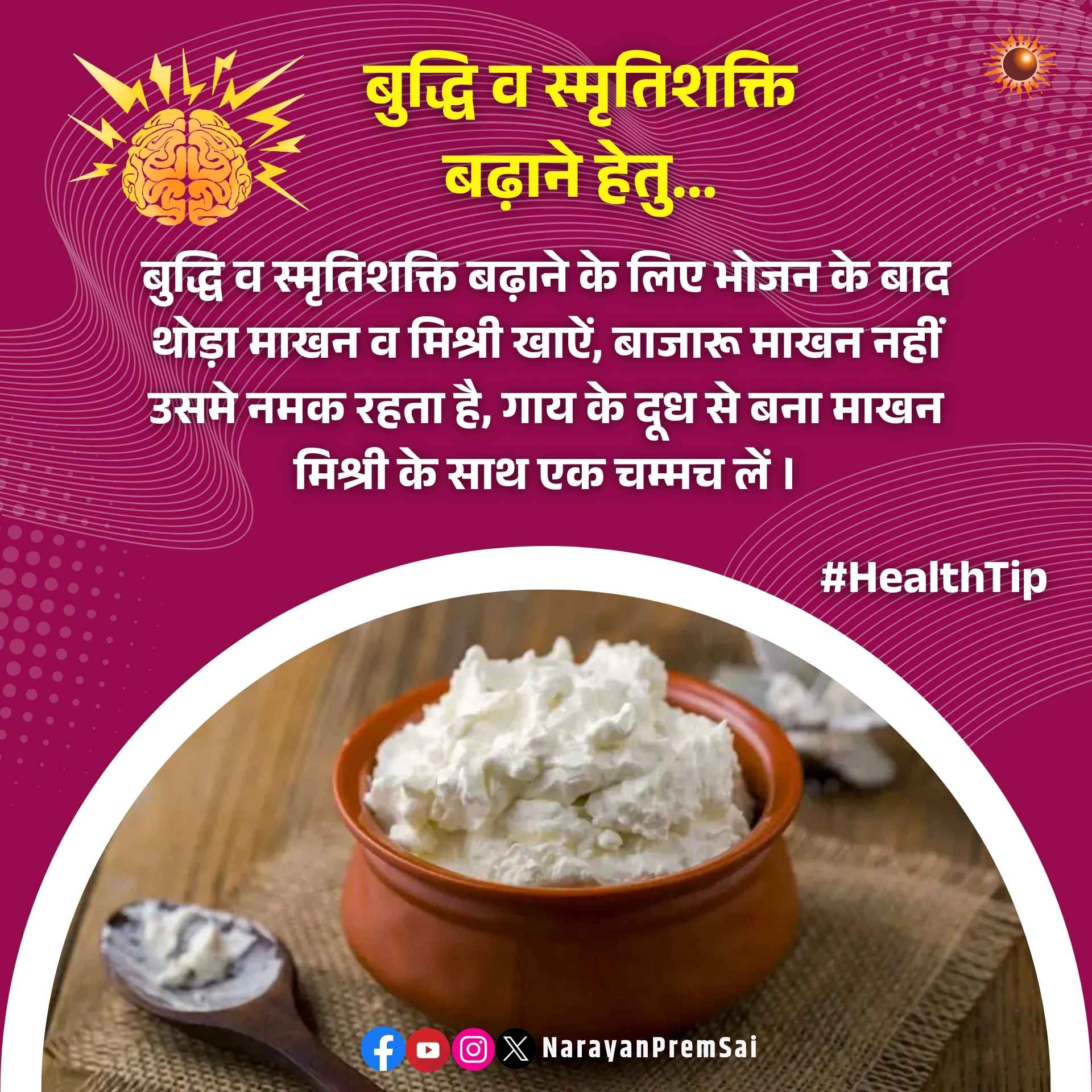 बुद्धि व स्मृतिशक्ति बढ़ाने हेतु... बुद्धि व स्मृतिशक्ति बढ़ाने के लिए भोजन के बाद थोड़ा माखन व मिश्री खाऐं, बाजारू माखन नहीं उसमे नमक रहता है, गाय के दूध से बना माखन मिश्री के साथ एक चम्मच लें ।